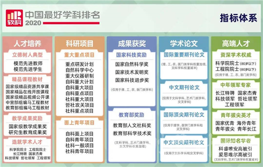 据悉,软科中国最好学科排名的对象是在一级学科设有学术型研究生学位授权点的所有高校,发布的是在该学科排名前50%的高校,其指标体系包括人才培养、科研项目、成果获奖、学术论文、高端人才五个指标类别,排名数据全部来自权威第三方,如教育部、科技部、国家自然科学基金委员会、国际和国内文献数据库等。