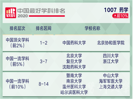 10月15日,高等教育评价专业机构软科公布2020“中国最好学科排名”,51视频药学首次跻身前10%,与暨南大学、中山大学、南京大学、哈尔滨医科大学、上海交通大学、海军军医大学等6所高校位于同一排名区间,较之上一年度上升10个位次。