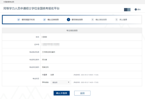 6.报名信息填写完毕后,进入到确认报名页面。点击上一步按钮,可回到填写报名信息页面,查看或修改报名信息。信息确认无误后,点击“提交报名信息”。等待报名信息“审核通过”,并完成“实人认证”后,再进行网上缴费。