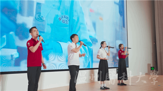 现场,参会领导和老师为新生代表佩戴校徽,新生之间互相佩戴校徽。温医大校旗校训在新生中传递。随后,举行全体新生“医学生誓言”宣誓仪式。