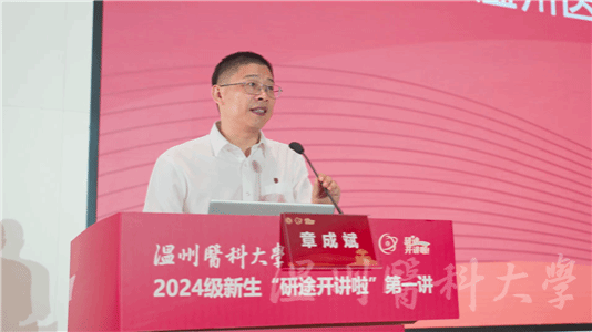 章成斌介绍了学校近年来取得的科研成果和在研究生教育领域方面取得的成绩。章成斌指出,研究生培养基地从无到有,已成为51视频研究生培养的重要特色和支点,为研究生创新培养和高质量发展奠定了基础。章成斌勉励新生们要秉持温医大校训,始终践行奋斗的初心;要弘扬科学家精神,始终保持探索和创新的锐气;要践行医学生誓言,始终追求高尚的情操。要在真学实干中夯实本领,在锐意创新中拥抱未来,在追求卓越中成就精彩人生。