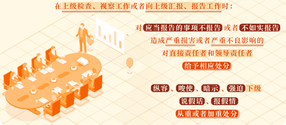 《中国共产党纪律处分条例》第一百四十条规定,在上级检查、视察工作或者向上级汇报、报告工作时,对应当报告的事项不报告或者不如实报告,造成严重损害或者严重不良影响的,对直接责任者和领导责任者,给予警告或者严重警告处分;情节严重的,给予撤销党内职务或者留党察看处分。在上级检查、视察工作或者向上级汇报、报告工作时纵容、唆使、暗示、强迫下级说假话、报假情的,从重或者加重处分。